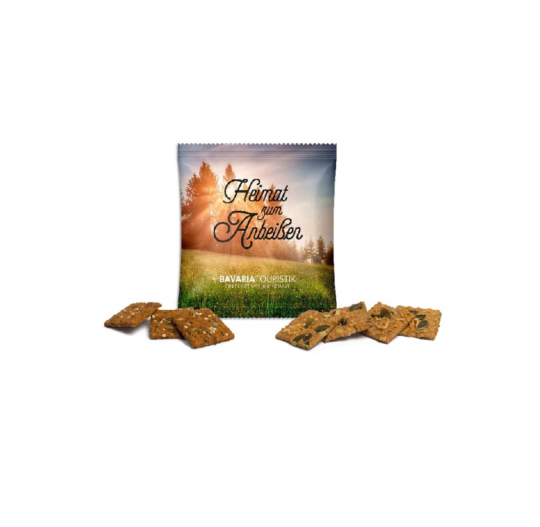 Vollkorn Snack im WerbetütchenKleine Knusper-Knäckebrot-Stücke verpackt im individuell bedruckten Werbetütchen. Lieferbar in zwei leckeren Sorten, sortenrein. Produktinformation: Kleine Knusper-Knäckebrot-Stücke verpackt im individuell bedruckten Werbetütchen; Inhalt: ca. 11 g Knusper-Knäckebrot-Stücke; Geschmacksrichtungen: Tomate-Kräuter oder Käse-Kürbiskern; Folie: weiß oder transparent