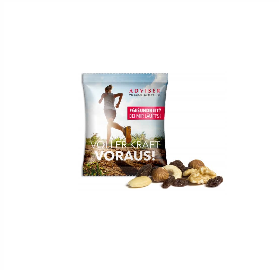 Mandeln im WerbetütchenMandeln verpackt im individuell bedruckten Werbetütchen. Inhalt: ca. 12 g Mandeln; Mandelsorten: Mandelmischung, Kokos, Zimt, Sahne-Kakao (weitere Mandelarten auf Anfrage); Folie: weiß oder transparent. Für dieses Produkt sind auch die nachhaltigen Verpackungen aus Papier/PE oder kompostierbarer Folie verfügbar.